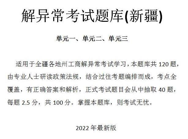 为了便于企业学习,提高考试通过率,我们组织了专业人士研读上述政策法规,并结合过往考题编排制作了《解异常考试题库》,考点全覆盖,有正确答案和解析,正式考试题目不会超出本题库内容。掌握本题库,则考试无忧。